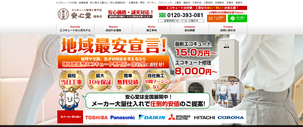 | 主な取扱メーカー | パナソニック、日立、ダイキン、三菱電機、コロナ、長府製作所など |