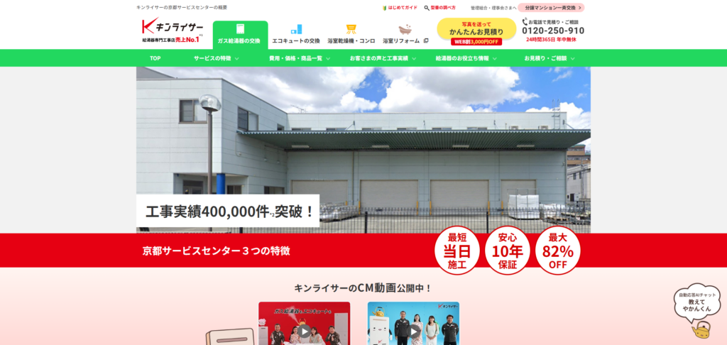 | キンライサー 京都サービスセンター | ![]() | 詳細を見る | 株式会社キンライサー | 全国 | 無料 | 電話受付24時間(年中無休) | 総額336,000円〜 | 現金、クレジットカード、NP後払い、QR決済、ローン | メーカー保証10年、工事保証10年(いずれも無料) |