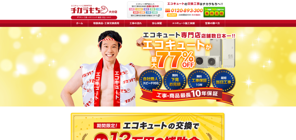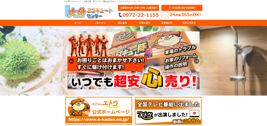 大分エコキュートセンター詳細を見る株式会社カデンのエトウ大分県広域無料24時間365日 年中無休206,800円~※クレジットカード、銀行振込、カードローン通常保証、保証延長サービス(任意)